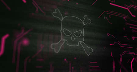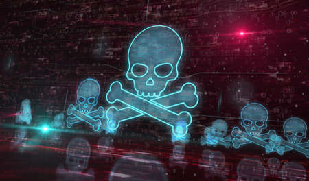 Skull pirate, online cyberattack, hack, threat and breach security symbol digital concept. Network, cyber technology and computer background abstract 3d illustration.