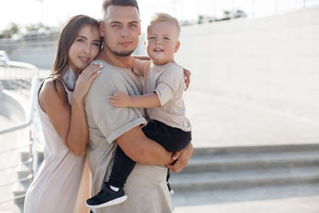 Young family with a child on a walk in the city in summer. Love and trust as family values. Mother and father with son outdoor. Summer vacation of happy family. Child with father and mother. Family with small kid on mothers or fathers day.
