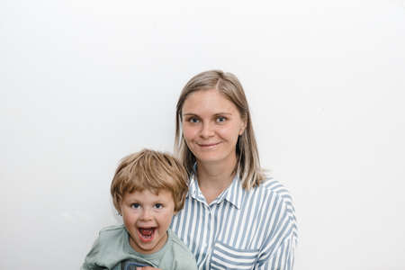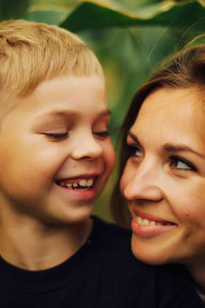 Portrait of a happy mother and her son outdoor. Series of a mother and son outdoor portrait in a park. Portrait of smiling mother and son. Family photo. The concept of a happy family.