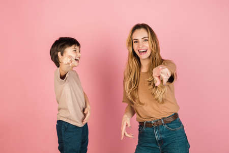 Young woman and little boy, mother and son isolated over pink background.