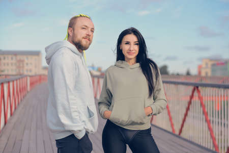 A man and a woman in sweatshirts stand on a bridge getting ready for their morning run