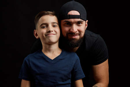 Portrait bearded father and little son smile for camera on black background
