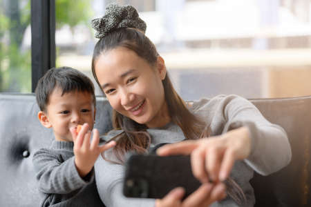 beautiful young mom and cute little boy are sitting together, using a smart phone and smiling and take Selfie.