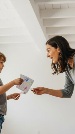 A full-body vertical composition capturing a mother and child interaction. The child presents a home