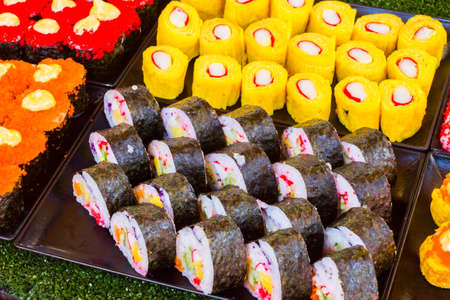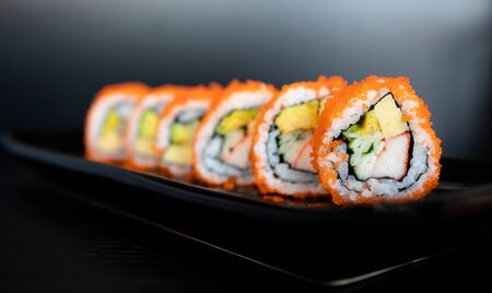 Japanese sushi rolls lying on a black wooden board. selective focus