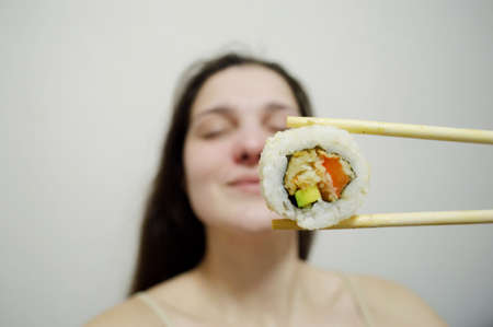 Beautiful young woman eating sushi with wooden chopsticks on a light background.