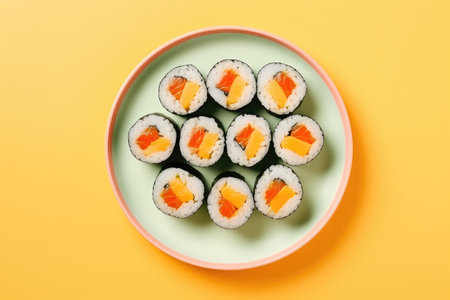 Kimbap or Gimbap with salmon on a yellow background. Korean food.