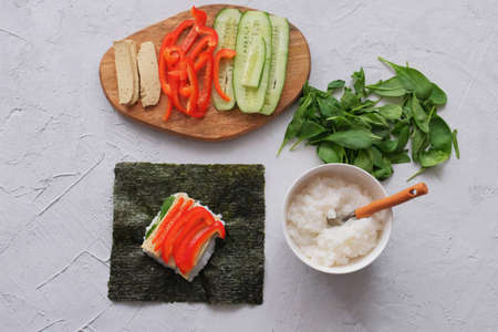 The process of making onigirazu, vegan sushi sandwich with vegetables (cucumber, pepper, spinach) and tofu. Trend Japanese food. Healthy food concept.