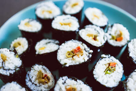 healthy plant-based food recipes concept, homemade vegan sushi with stir fried vegetable filling