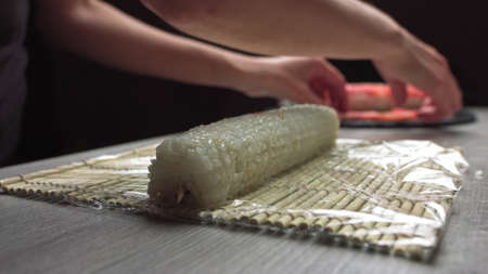 Cropped anonymous cook hands with rolling fresh sushi with bamboo mat while working in authentic Japanese restaurant,Close-up of chef's hands rolling a sushi roll on bamboo mat.Sushi making process.Rice, nori, avocado, crab, red tobiko caviar.Rolls the sushi roll.
