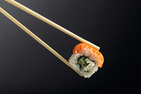 Hand holds with Chinese sticks roll of sushi on black background. Set of sushi to go and hand with one roll.