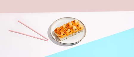 Hot maki roll with cheese on colored background. Baked sushi roll with salmon inside, rice outside, cheese topped. Maki sushi in minimal style. Japanese menu concept