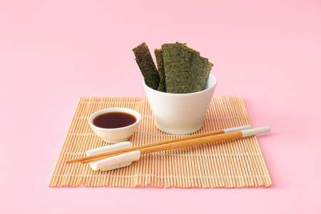 Bowl of tasty seaweed sheets, chopsticks and bowl with soy sauce on pink background