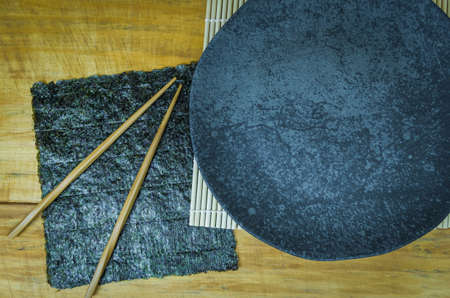 A black slate plate with chopsticks. An empty sushi plate on a white table. Place for text