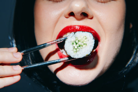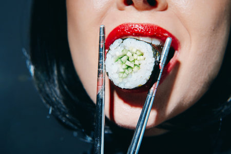 Close-up of a woman with bold red lips eating sushi with chopsticks, highlighting her enjoyment and vibrant colors against a moody dark background.