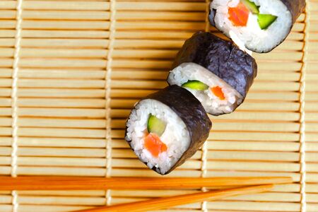 Sushi rolls on sushi mat background. Top view, copy space for the text