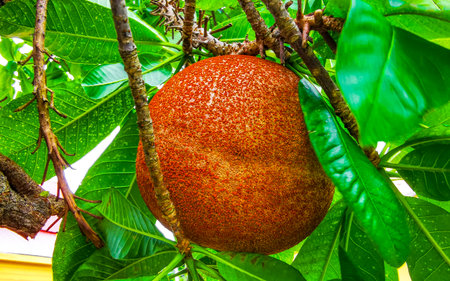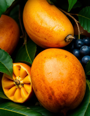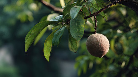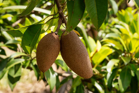Ripening Sapodilla fruits in an organic garden. Other names - Zapota, Chikkoo Sapota. Sapodilla is a tropical, evergreen tree fruit berry with exceptionally sweet and malty flavor.