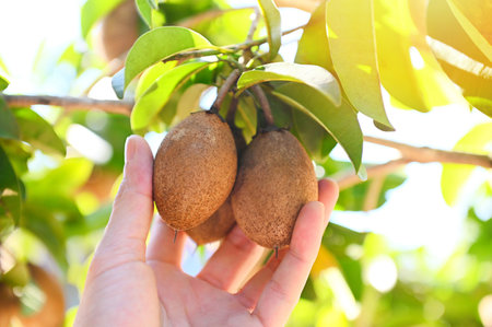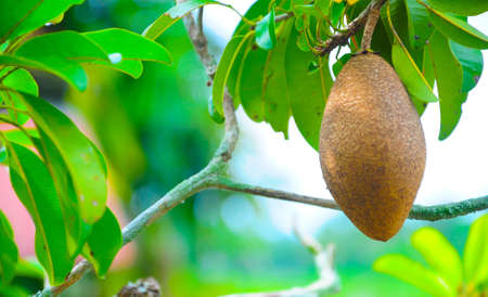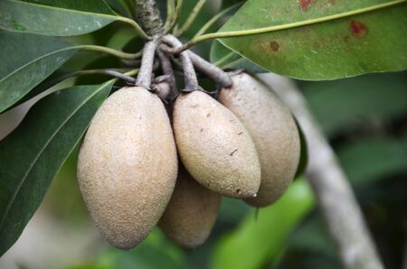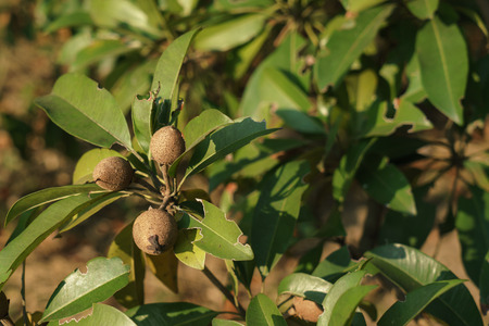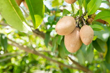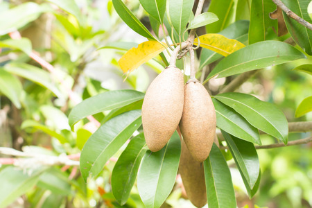 sapodilla fruit on the sapodilla tree plant on summer, sapodilla plum in the garden fruit in thailand