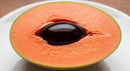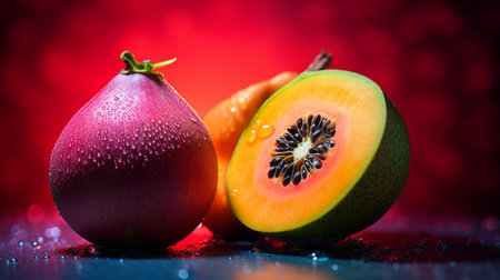 A 3D illustration of a lucuma fruit. showcasing its vibrant yellow flesh and purple seeds. The fruit is placed on a wooden table with palm trees and blue sky in the background. offering a tropical. exotic feel.
