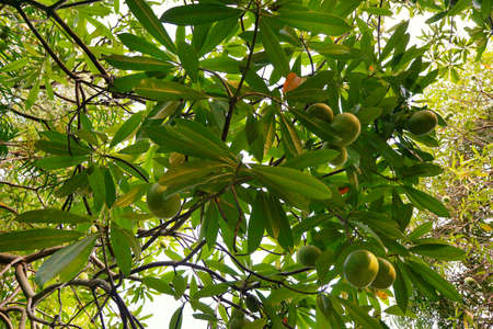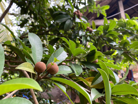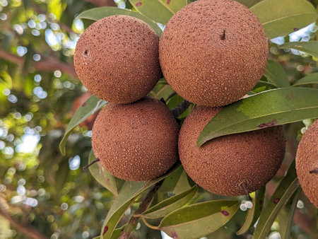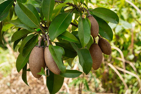 Ripening Sapodilla fruits in an organic garden. Other names - Zapota, Chikkoo Sapota. Sapodilla is a tropical, evergreen tree fruit berry with exceptionally sweet and malty flavor.