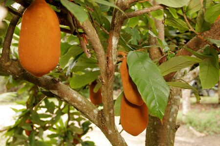 The Jackfruit tree in summer, Bright sunlight pierces dense foliage, the air feels hot, natural color