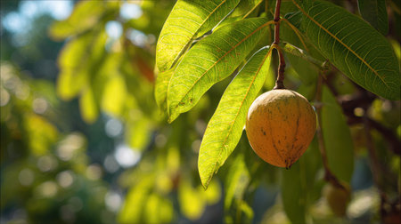 A sunlit portrait of a single Sapodilla, photographed outdoors on a clear, breezy day. Fresh, crisp air renders vivid detail in the leave veins glowing with gentle backlight. The background falls into a soft natural bokeh of greenery, colors true-to-life, organic beauty in pure sunlight.