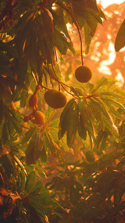 The Breadfruit tree at sunset, Golden red sunset light filters through the leaves, still atmosphere, warm orange glow blending with natural green