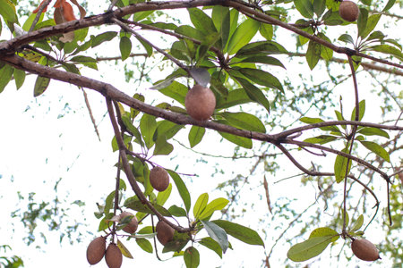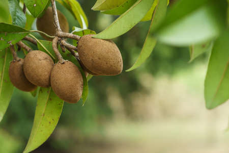 sapodilla fruit on the sapodilla tree plant on summer, sapodilla plum in the garden fruit in thailand