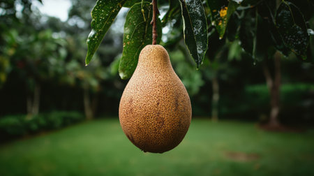 A detailed photograph of a single Mamey sapote, swaying gently in the wind, captured in natural daylight. Fresh and airy atmosphere, soft motion blur on leaves, crisp details on textures, background softly blurred into natural greenery, cinematic natural light, realistic photography.