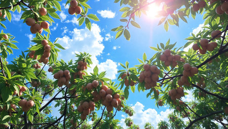 Sweet fruit tree branch. Summer tropical fruits in an organic farm. Green leaves in background. Back lit by sunset sunlight in summer evening.