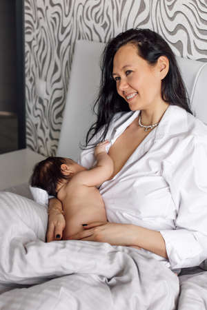 Happy young mother, dressed in a white nightgown, sitting in the bedroom with her newborn son in her arms, gently supports the child's head with your hand, feeds the baby's chest, the boy greedily sucks her mother's breast