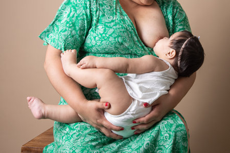 front view of a mother breastfeeding her child, skin to skin on black background,