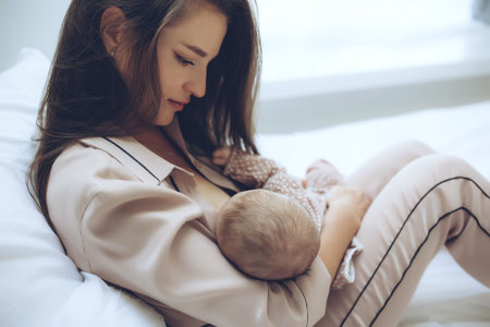 Beautiful woman breastfeeding her baby in a cozy house on the bed.
