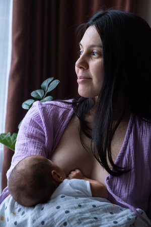 Close-up of a loving caring mother breastfeeding her baby boy. View from above