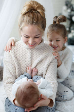 Happy woman, cheerful mother and little children, a girl and a newborn boy sitting on a fluffy white blanket beside the Christmas festive green Christmas tree with white toys, snowflakes, white bows and glowing lights.
