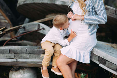 little baby boy touches his pregnant moms belly