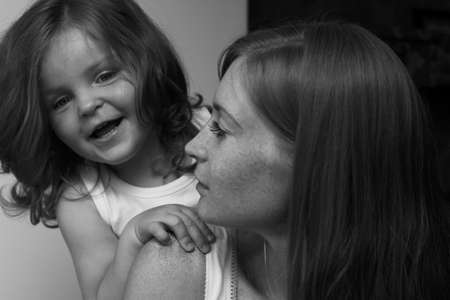 Closeup black and white group portrait of Caucasian mother and daughter baby girl hugging smiling laughing. Family on autumn fall winter season. Happy lifestyle childhood concept.