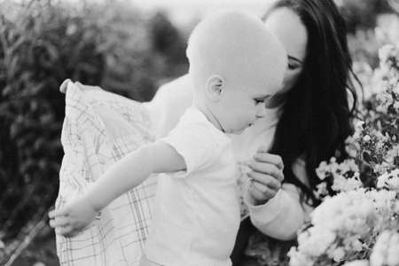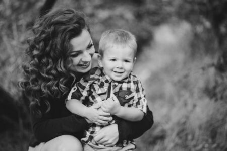 Young mother with her little son outdoor in the park, black and white