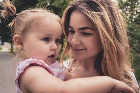 portrait of beautiful mother hugging her baby daughter outdoors on a sunset. mother's, baby's day. concept of family summer holiday. selective focus.