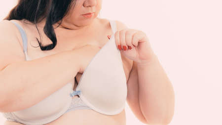 Plus size fat mature unrecognizable woman wearing bra, on white. Female breast in lingerie. Bosom, brafitting and underwear concept.