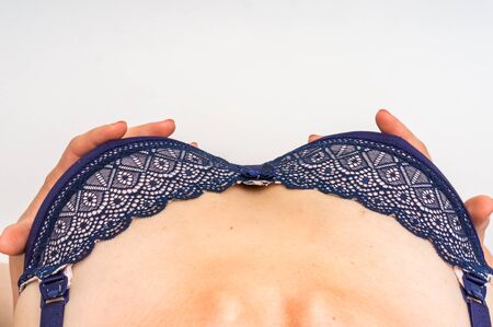 Woman brest in bra. Natural brest. Silicone implants