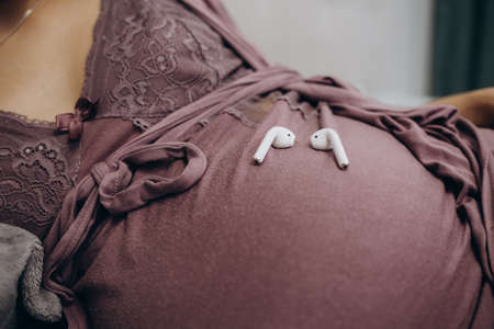 Late pregnant woman applying big wireless headphones to big belly for unborn kicking baby listening to relaxing classical music, audiobook. Peaceful expectant mom taking sound therapy. close up