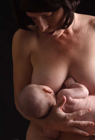 front view of a mother breastfeeding her child, skin to skin on black background,