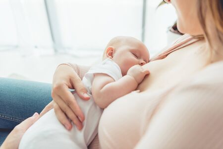 cropped view of mother breastfeeding her child in apartment