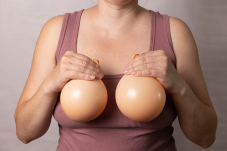 A woman holds two inflated balloons against her chest, visually representing the idea of breast implants or plastic surgery for enlargement or reconstruction.