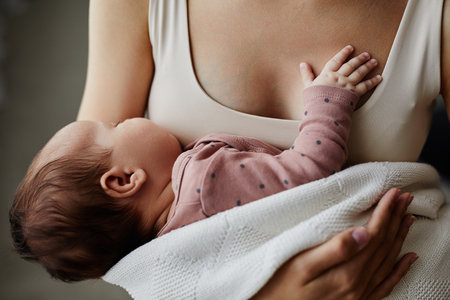 Skin-to-skin contact between mother and baby, close view