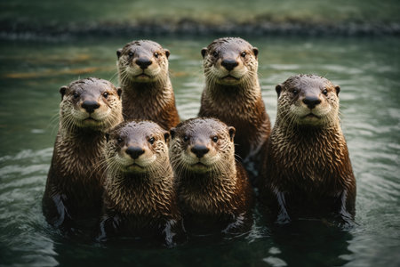 group of otters playing in a river, with lush greenery and rocks in the background.