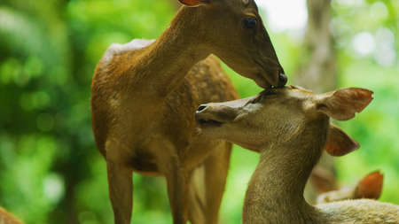 Two deer stand in a dense forest, surrounded by tall trees and lush vegetation. The mother deer and its fawn are the focal point, with rich brown fur contrasting against the vibrant green leaves. The lighting suggests a day setting, ideal for nature-themed projects, editorial content, and commercial use.
