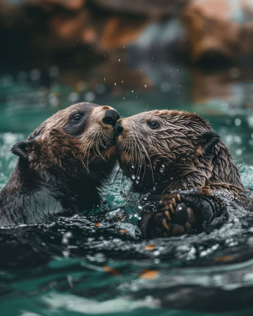 Behold the enchanting embrace of two playful otters, captured in an idyllic river setting Their joyous antics and heartwarming companionship exude pure cuteness, making this photograph a heartwarming portrayal of the wonders of wildlife AI Generative