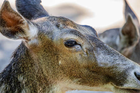 Single sika deer on a sunny day. Animal theme. Wildlife park in Warstein, Germany